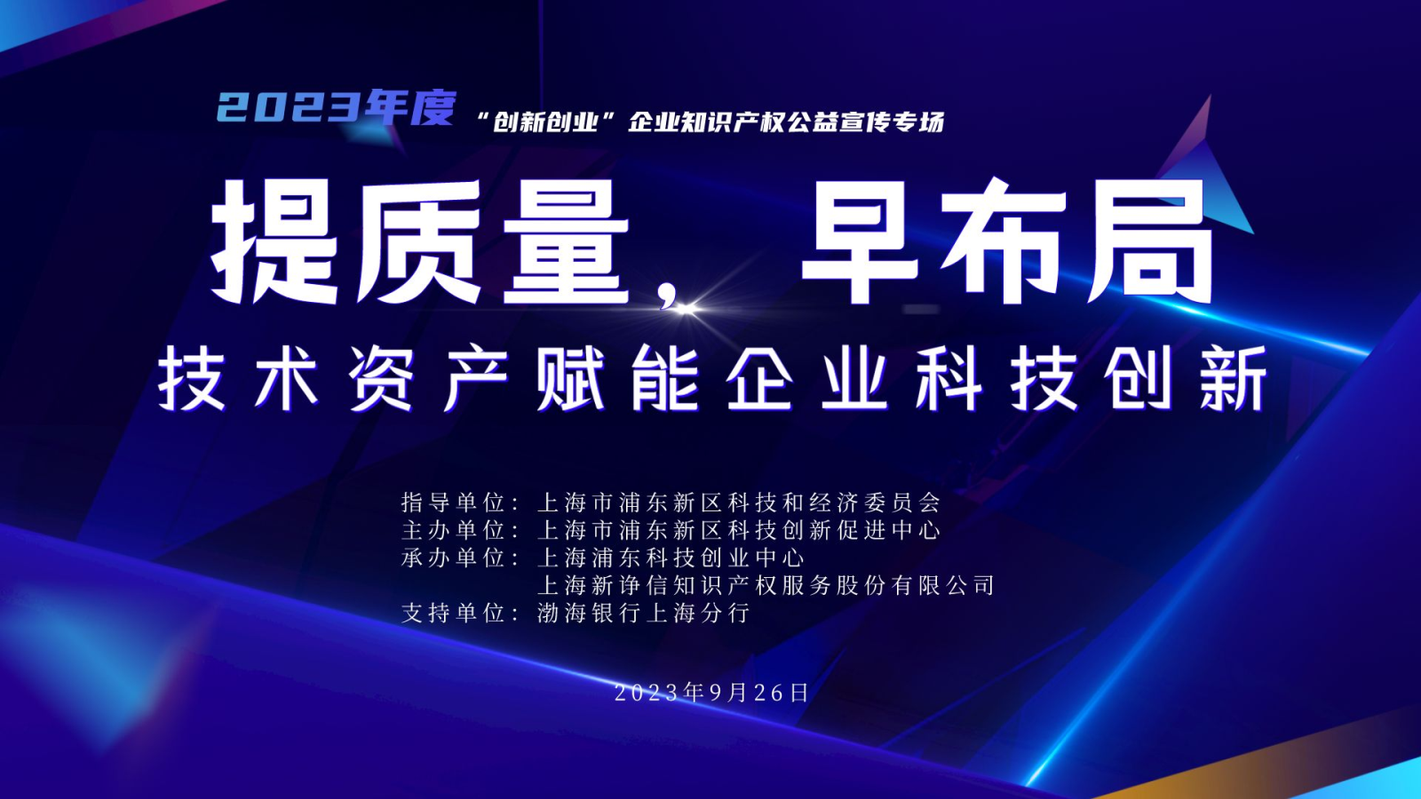 2023年9月26日,“提质量,早布局”技术资产赋能企业科技创新——2023“创新创业”企业知识产权公益宣传专场在渤海银行上海分行举办。本次活动由上海市浦东新区科技和经济委员会指导,上海市浦东新区科技创新促进中心主办,上海浦东科技创业中心、上海新诤信知识产权服务股份有限公司承办。
