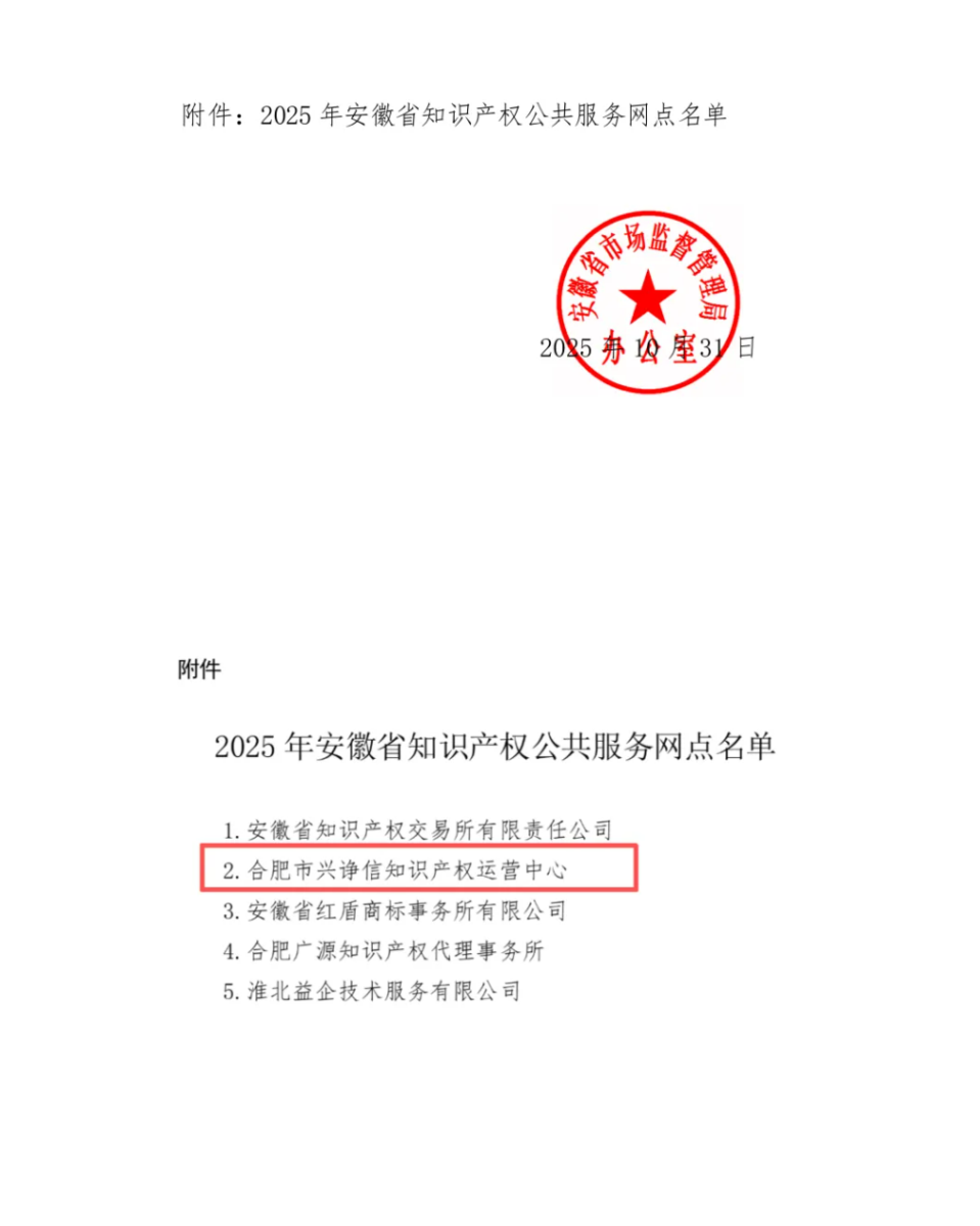 近日,安徽省市场监督管理局(安徽省知识产权局)正式公布省级知识产权公共服务网点认定结果,合肥市兴净信知识产权运营中心(以下简称“兴净信”)成功入选!